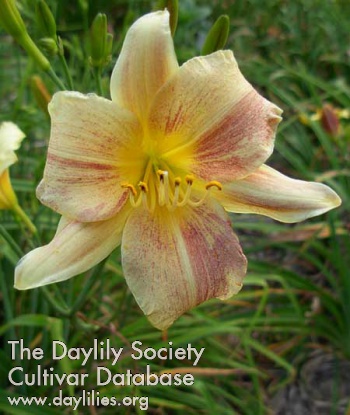 very light creamy yellow petals with lavender to purple specks, dots, dashes and stripes of color, yellow throat, trumpet shaped, triangular blooms, multiple rounds of bloom