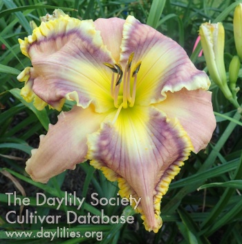 Pink with a purple band, purple and gold petal edges, ruffled sepals with a few small teeth.
