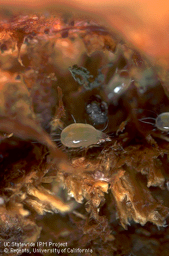 Have been found in several countries including the USA, Canada and Europe. These are very small shiny whitish mites with reddish brown legs, sometimes having two brown spots on the back. Bulb mites feed in colonies in rotting tissue, usually at or below ground level, and are found on many different plants. You may see groups of tiny white specks some of which, if you watch very carefully, may be observed to be moving slowly. A magnifying lens is necessary for more detailed inspection. While they are often secondary to some other damage to the plant such as mechanical injury, insects etc., these mites are also thought capable of attacking healthy tissue and can introduce diseases with the pathogens they carry. Bulb mites can survive in the absence of a growing plant by feeding on other organic matter. If plants are growing poorly, send a sample to your Extension Diagnostic Service, or your country’s equivalent, for investigation and advice.