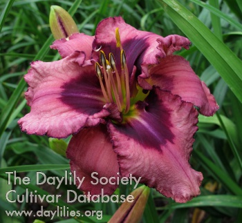 rose pink with silver overlay and elderberry purple eye, petals are tightly pleated with cristation extending upward from the pleated platform, petal edges are ruffled and lined in elderberry purple, small yellow to green throat