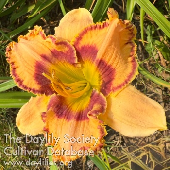 Golden peach with a lime green throat, bordeaux cherry eye and toothy, ruffled petals edged in diamond dusted gold.