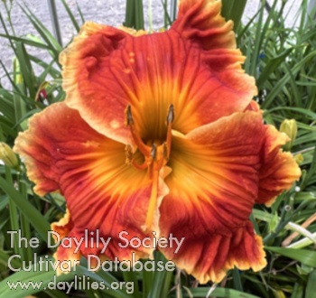 Bright brick red (RHS 42A, diffuse, pale yellow ruffled edge, heavily engraved.