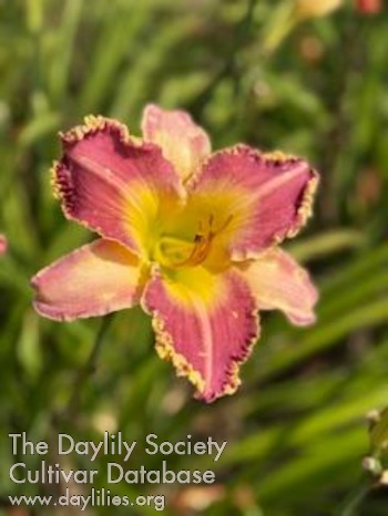Mauve with yellow throat and midribs, and yellow teeth.