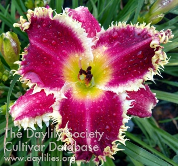 Purple red bitone with red watermark above a green yellow throat, petals and sepals edged in white yellow shark’s teeth, white sepal tips.