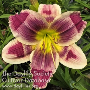 Cream ivory with plum purple eyezone, intricate violet veining, and bright yellow to chartreuse throat.