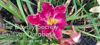 Cranberry with watermark, green heart, white ruffled edge around petals and sepals, fertile both ways.