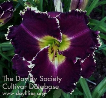 Dark maroon purple, white knobby edge, dark ruffles, white teeth, light midribs, green to gold throat, full form.