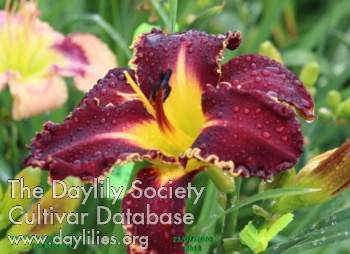 Black purple with fine gold edge, lime to green throat.