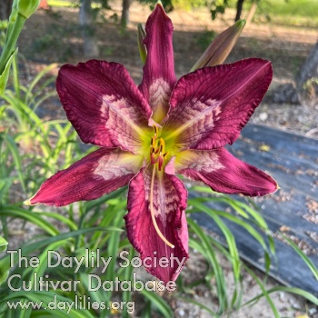 Purple with a white and purple patterned eye, green throat.