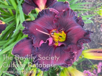 Dark purple with one quarter inch, ruffled edge, green throat, thick scapes, Northern hardy, fertile both ways.