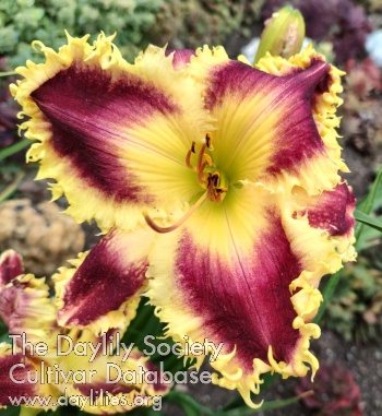 Purple with a red purple watermark above an extended green yellow throat, petals and sepals edged in yellow shark’s teeth, lighter midribs on petals, sepals are yellow on top.