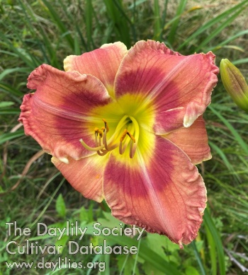Dusted cherry with darker eyezone and yellow throat, yellow edge on sepals, slight piecrust edge.