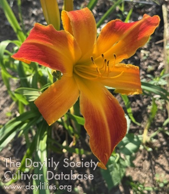 Red petals with extended yellow eyezone, yellow midribs, and a small green throat.