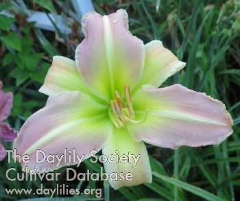 Baby pink bitone with creamy midribs above a bright yellow green throat.