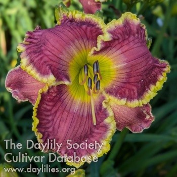 Boysenberry petals with a rose halo, small yellow rimmed green throat, and frilly yellow edges.