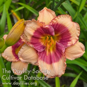 Peach pink with rose eye, ruffled narrow edge and yellow green throat.