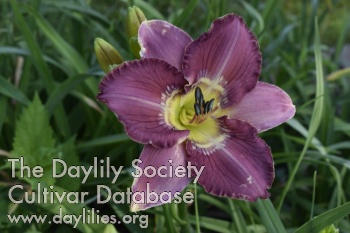 Ruffled petals in plum and deep rose shades with cream etching, lighter plum sepals, and a small green throat.
