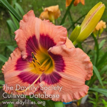 Peach pink with red outlined purple eye above yellow green throat.
