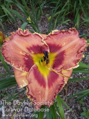 Coral orange, raspberry eye, green throat, heavily ruffled yellow edge, and light midribs.