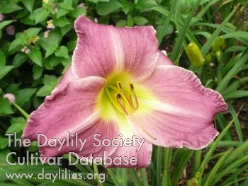 medium red violet veined and shaded light burgundy with raised lavender midribs and yellow green throat