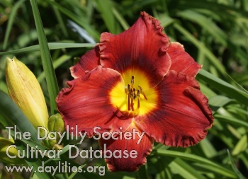 Bright red with darker red eye, yellow throat, pencil thin white edge on ruffles.