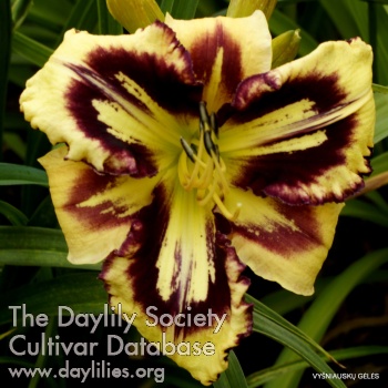 Light yellow with big white midribs and dark maroon patterned, appliqued eyezone on all segments, yellow throat, and maroon edge.