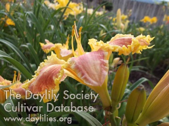 deep pink bitone with darker eyezone and veins with a ruffled edge and prominent long diamond dusted gold teeth, sepals have some gold teeth, all above a prominent green to yellow throat