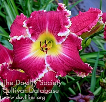 Red, thin white serrated edge, variable sepals, yellow throat.