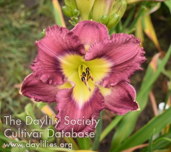 Pale violet red, light burgundy band, dark yellow throat, ruffled edge.