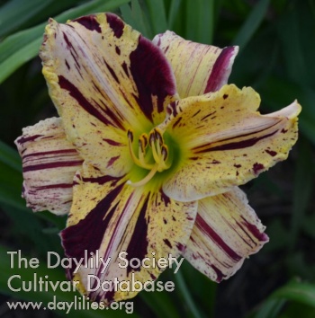 Variable yellow with deep cherry dots, blotches, and broken stripes, green throat, slightly ruffled petal edge.