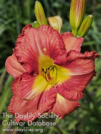 Cranberry, darker eyezone, yellow green throat, midribs and veining.