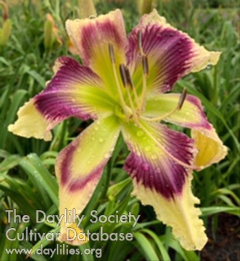Cream yellow with wine eye, bluish watermark above yellow to green throat, wine veins in eye.