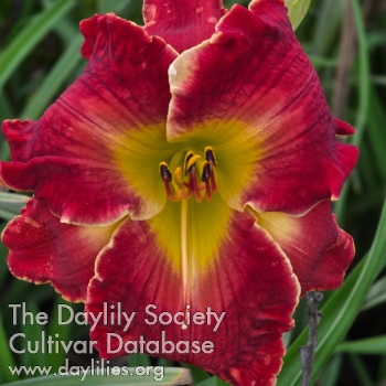 Wine red petals, tonal red halo, triangular yellow to green throat, creamy light yellow picotee .