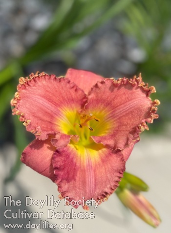 Deep, warm rose pink petals with lighter apricot eyezone, ruffled petals, apricot rose sepals, and bright yellow throat.