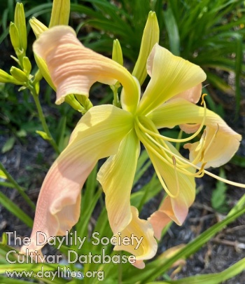 Pink peach petals to pinker with hints of lavender, extended green to yellow throat, evening opener.