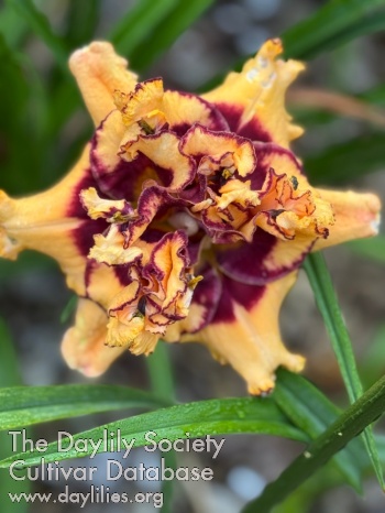 Butterscotch with maroon halo, green throat, and maroon ruffled edges on petals.