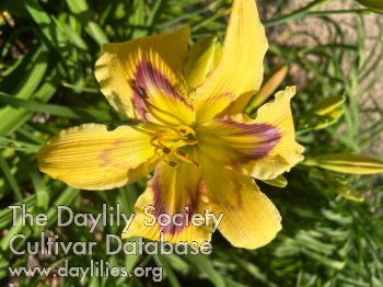 Yellow with purple patterned eyezone with yellow to green throat.