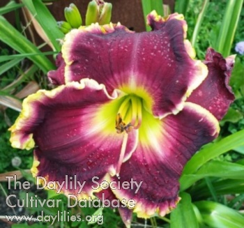 Burgundy with green to yellow throat, white halo, white midribs, and white, cream, and gold braided edge.