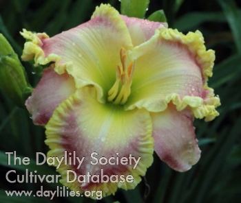 Light rose petals with large yellow to green throat, and large gold edge.