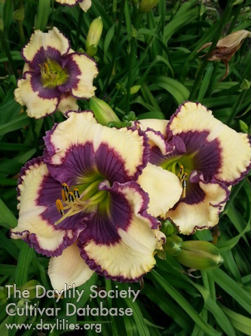 cream white base with dark purple eye and picotee edge above green throat