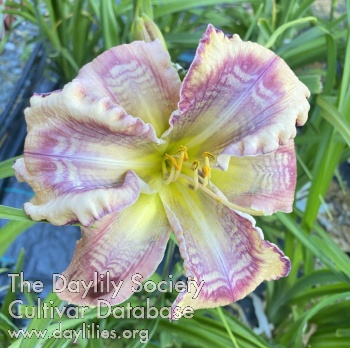 Ivory and lavender bitone with a large patterned eye of violet and white, violet and cream petal edge, white edge on sepals.