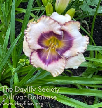 Very light beige flecked with gold tints, purple and lavender blended eye, multicolored midribs, ruffled purple edged petals, pineapple gold into green throat, diamond dusted.