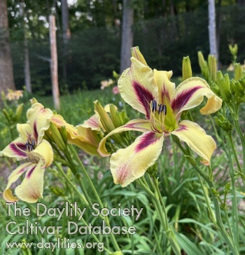 Soft cream with feathered purple eye which can be patterned, green throat, purple dots near tip of petals, ruffled and recurved.