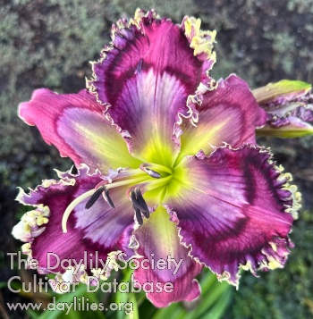 Rich magenta violet with bold dark plum eye, chartreuse to yellow throat, heavily ruffled edge trimmed in cream, wide form.