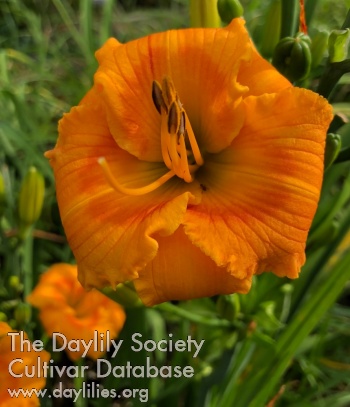 Bright tangerine with darker eye and veining, golden midribs, and green throat.