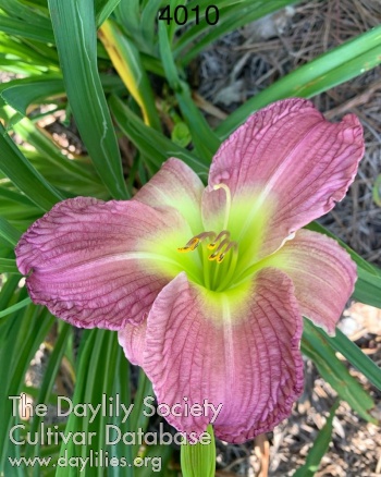 Lavender with grape veining, crinkled, with lime green throat.