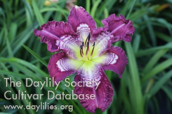 Medium to dark purple on very ruffled petals and sepals, eyezone usually has five or more layers of white and purple patterning, a white pencil line runs along the outer edge of the petals and sepals, green throat, easily fertile both ways.