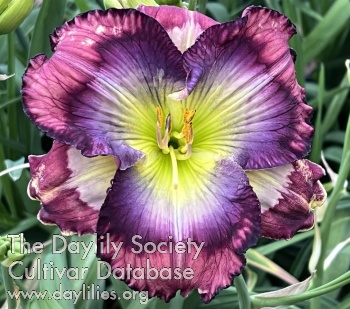 Mauve with large indigo eye fading to lilac, indigo edge on petals, large lilac patches on sepals.