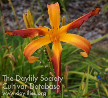 yellow orange throat that darkens at the very end of the petal to deep blood red, sporting a bright yellow midrib, tightly pinched petals with soft ruffles on the edges, recurved sepals