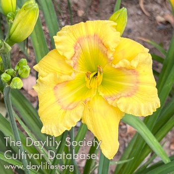 Butter yellow with light violet and thin, dark raspberry eye, large green to yellow green throat.